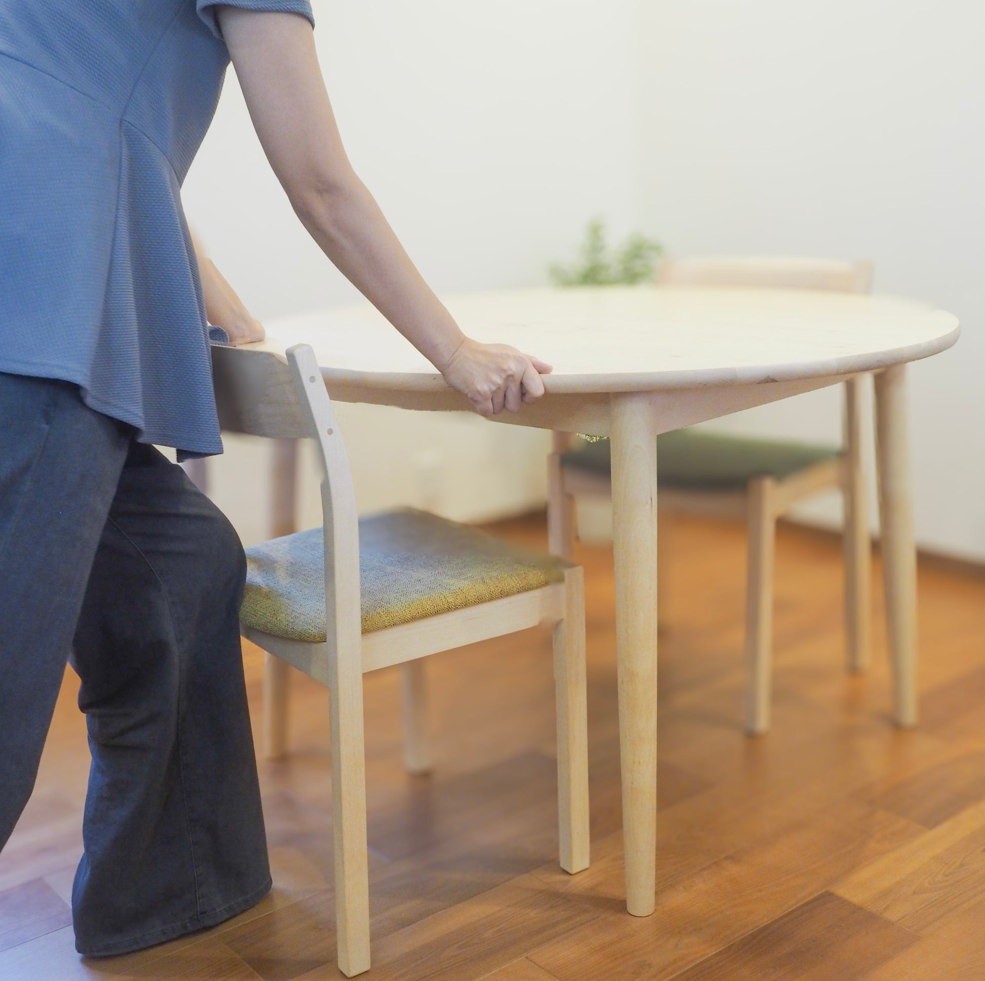 四角いテーブルだと大きく動かすのに少し構えてしまいますが、丸テーブルなら角がなく手を掛けやすいので、女性ひとりでもスッと移動できます。