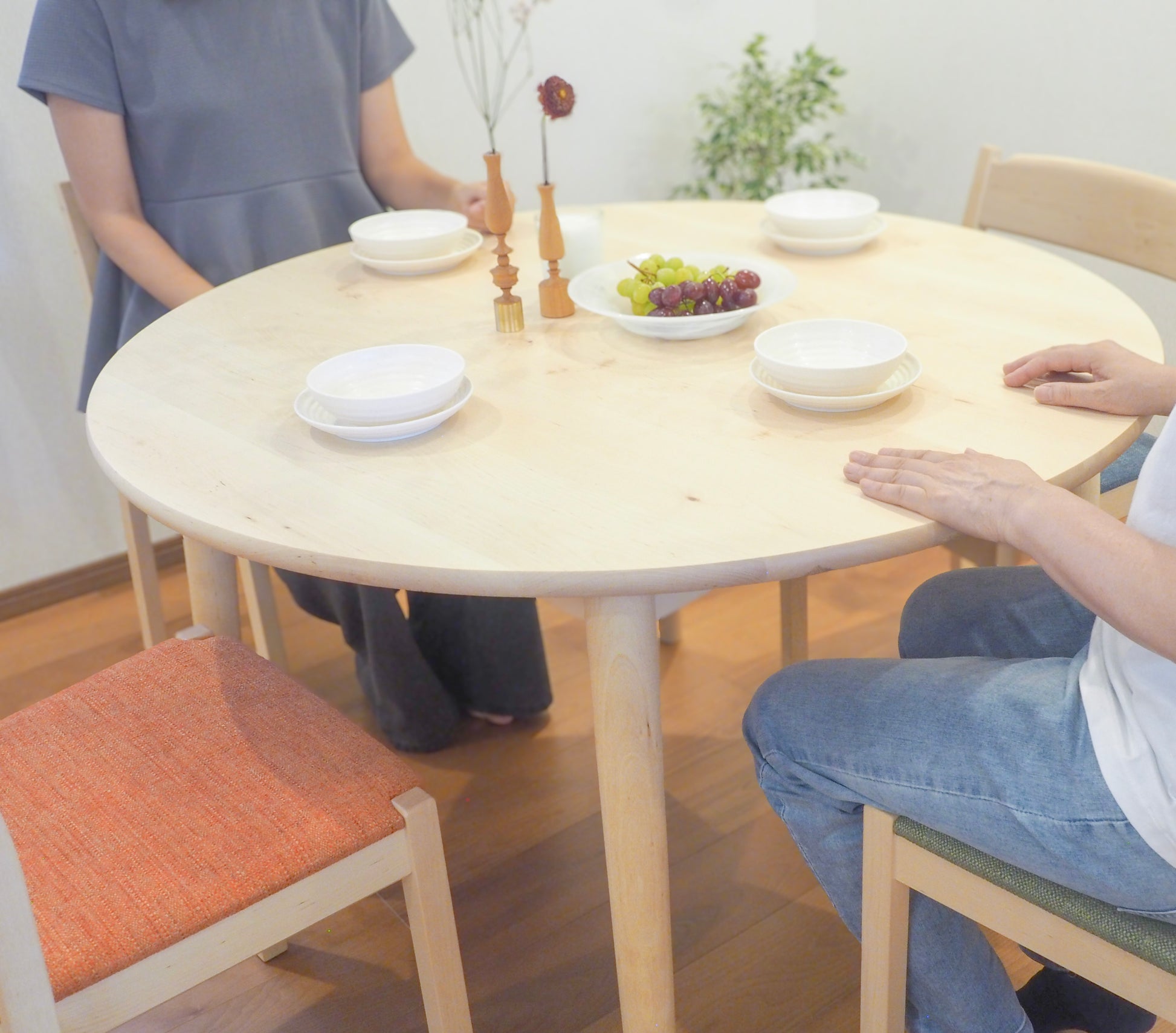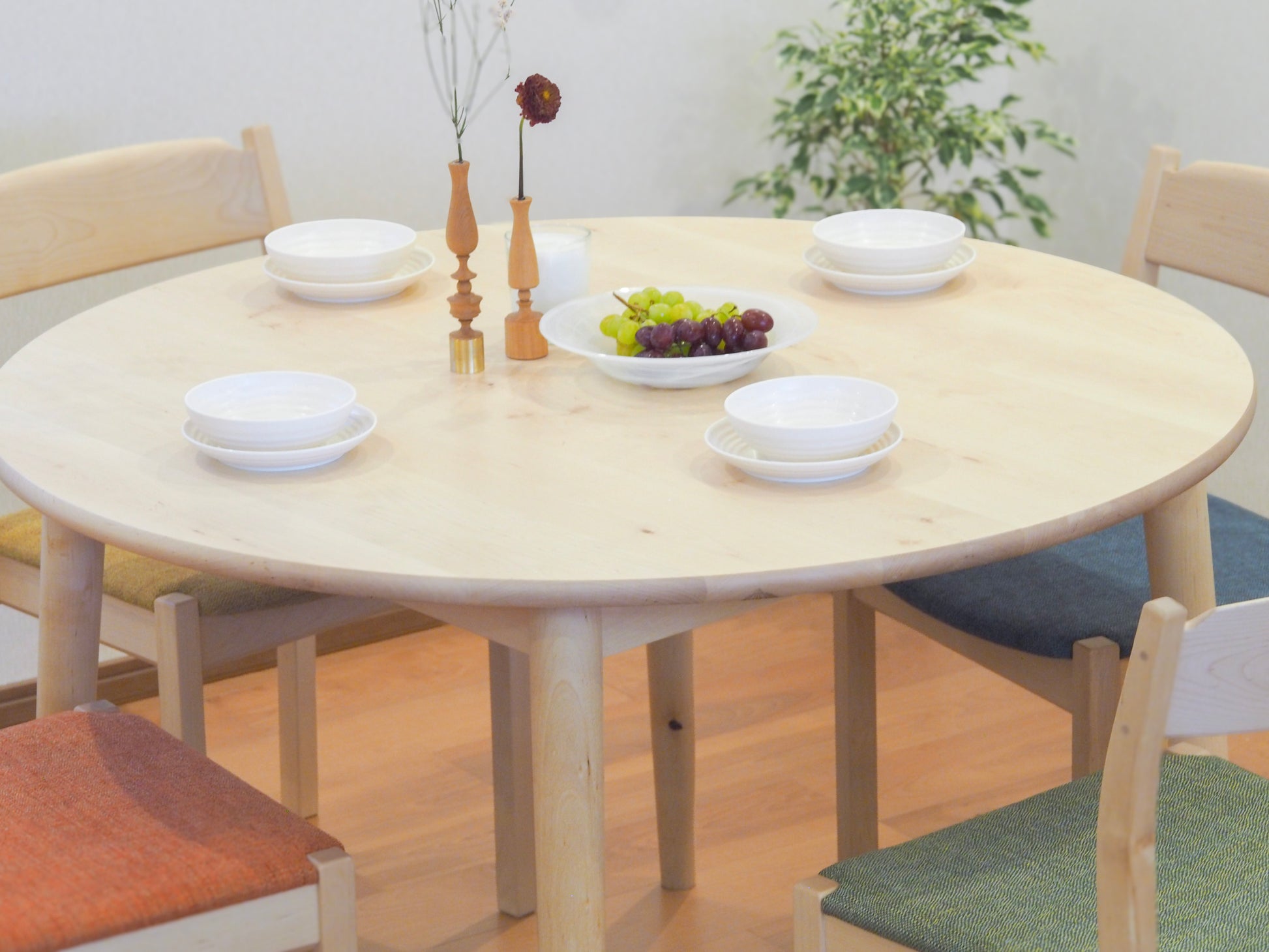 木肌はすべすべとしていて、手で触れたときに心地よさを感じられるのも特徴です。年月を重ねるごとに少しずつ深みを増し、暮らしの時間とともに風合いが変化していくのも無垢材ならではの楽しみ。日々の食卓を支えながら、時間の流れとともに「家族の歴史」を刻んでいく存在になります。