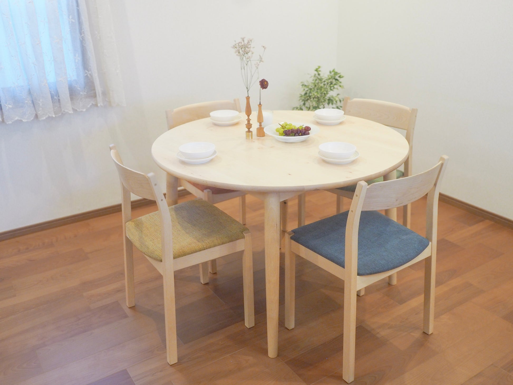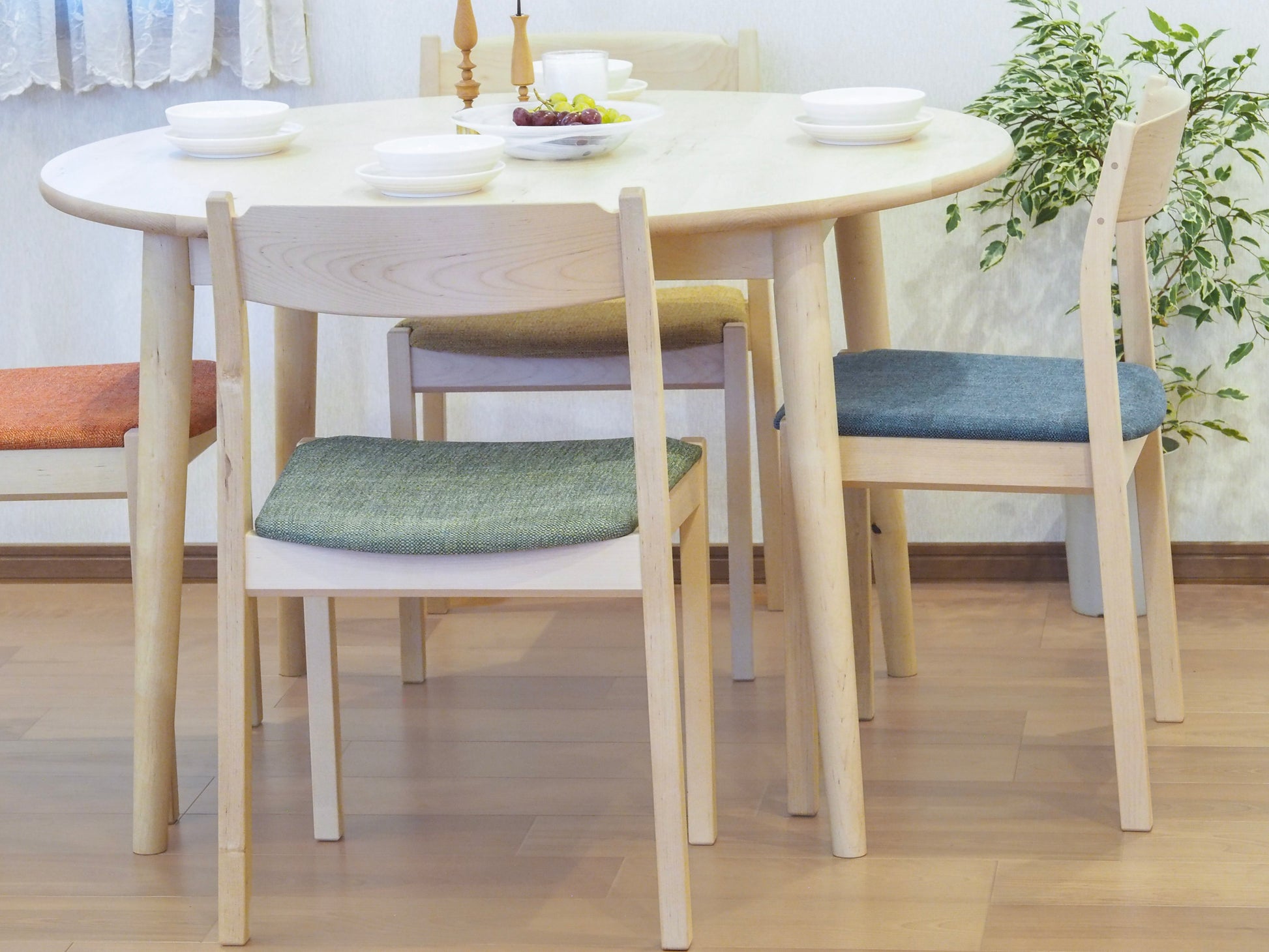 1〜2人暮らしでダイニングスペースが限られている方には、90cmや100cmもおすすめ。ワンルームや8畳ほどのお部屋でも、すっきりと収まり、空間を圧迫しません。一方で来客が多いご家庭や、ダイニングをゆったり使いたい方には、120cm〜140cmのサイズもご用意。