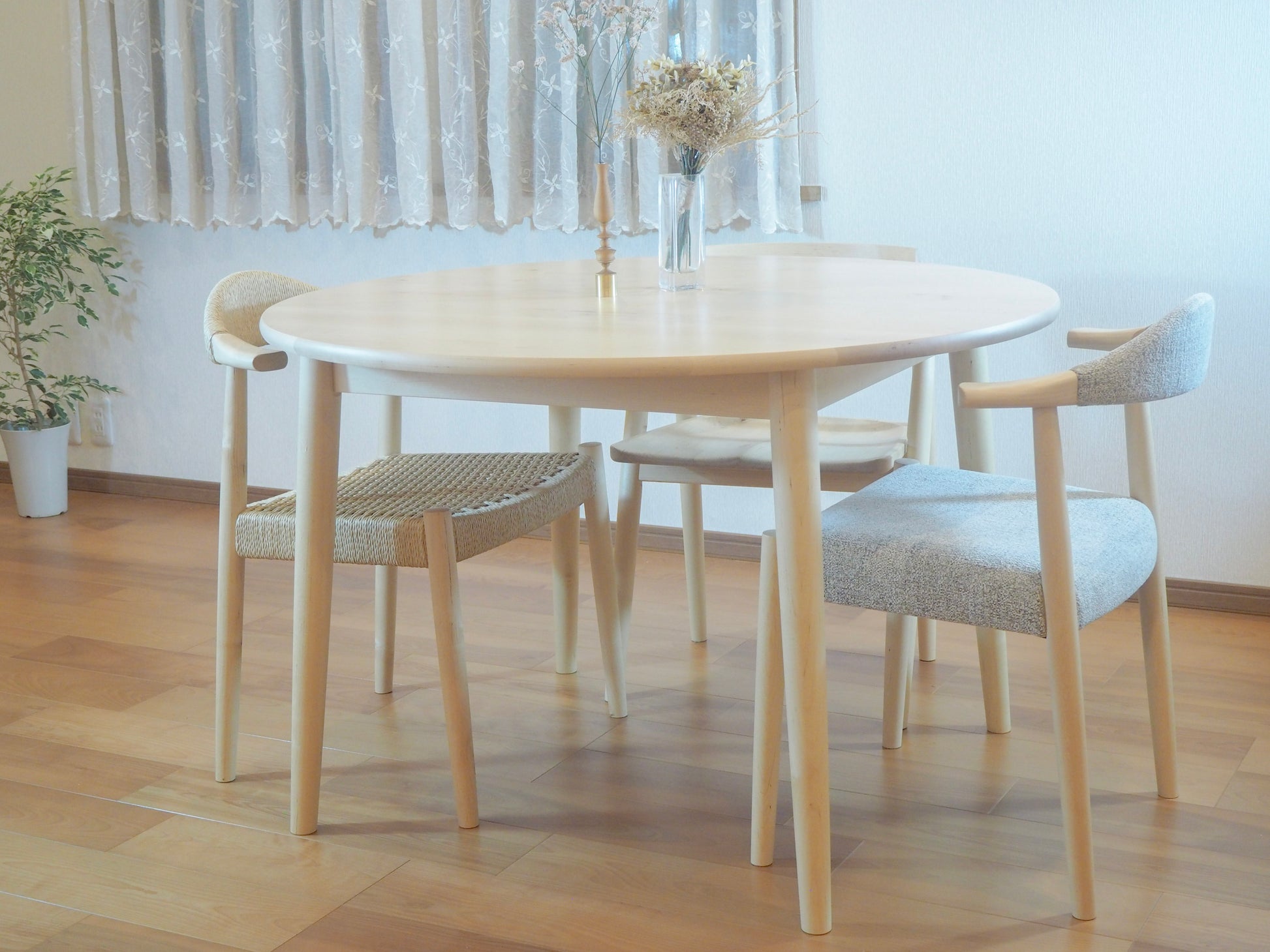 この丸テーブルは、直径90cmから140cmまで、10cm刻みで6サイズをご用意しています。今おすすめしている110cmは、2人〜4人で使うのにちょうどいいバランス。食事だけでなく、ノートパソコンやお茶セットを広げても狭さを感じず、心地よく過ごせます。