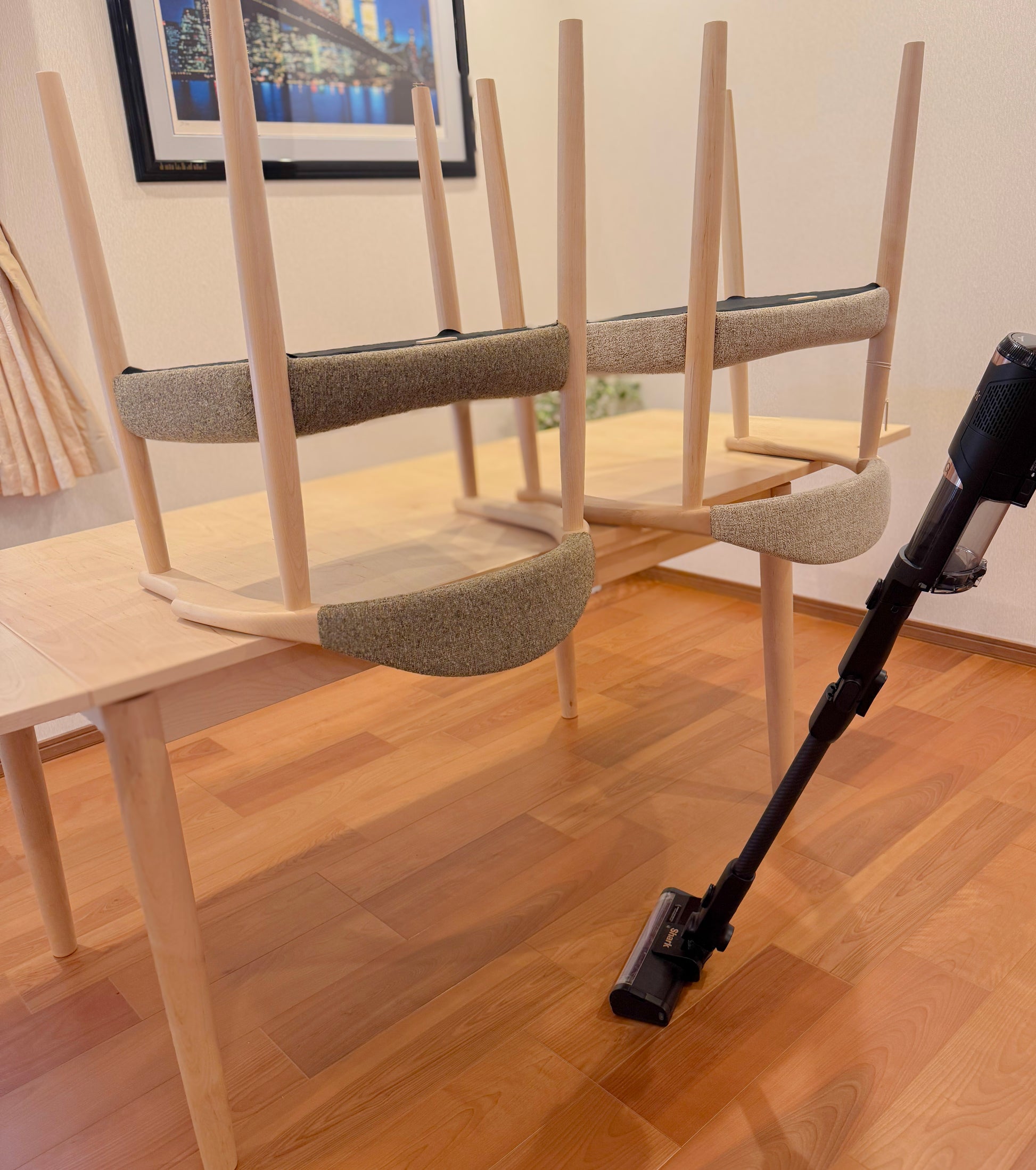 amチェアは、掃除の時にもテーブルの上へまとめて置くことができます。床がすっきりと空くので、掃除機やロボット掃除機もスムーズに通れ、毎日の掃除がぐっとはかどります。