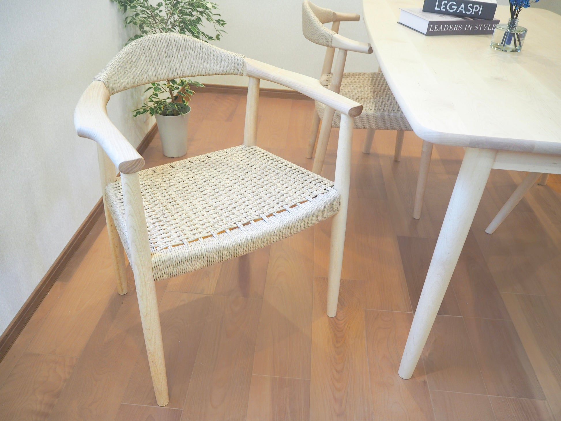 ▲ナチュラルな木のフレームと調和する、上質なペーパーコードの背もたれ。空間に軽やかな抜け感を添えます。