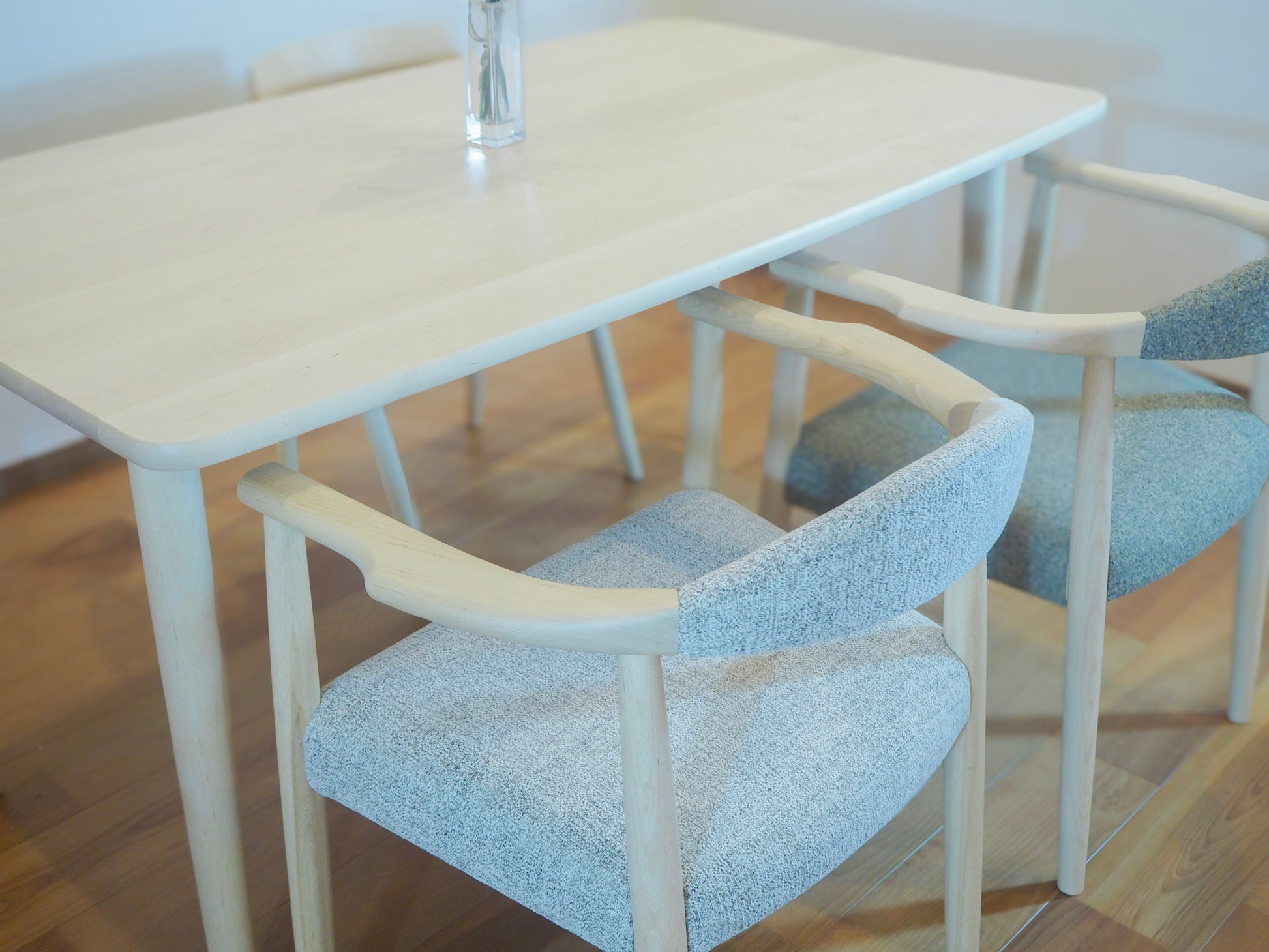 背もたれからアーム、そして脚へと流れるシルエットは、すっきりと整いながらも、しっかりと腕を預けられる安心感もあります。テーブルの横に並べた姿は凛としていて、空間に落ち着きを与えつつ、心地よい存在感を放ちます。