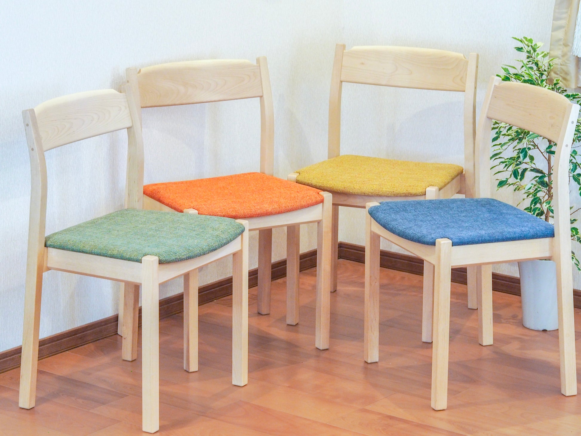 張り布はレッド・イエロー・グリーン・ブルーの4色。どの色も明るくやわらかいトーンで、木の風合いとよくなじみます。