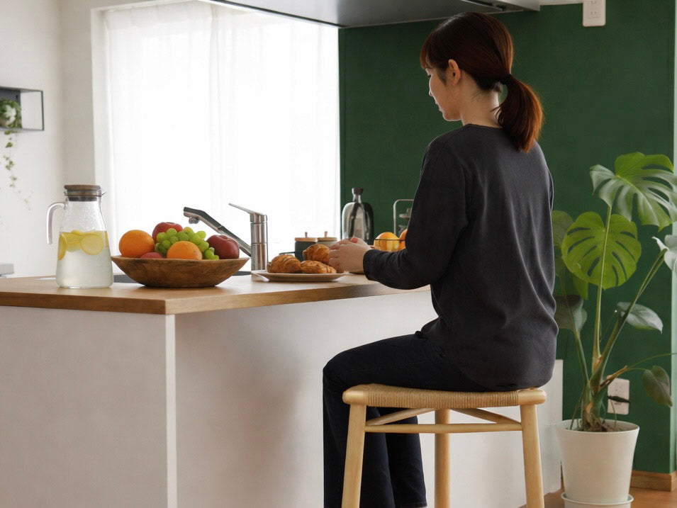 忙しい朝のクイックな朝食も、このスツールに腰掛ければ、まるでカフェの特等席にいるような気分に。背筋が自然と伸びる絶妙な高さが、淹れたてのコーヒーを楽しむ時間をより豊かなものにしてくれます。 キッチンの中に、無理のない“ひと休みの居場所”をつくってくれます。