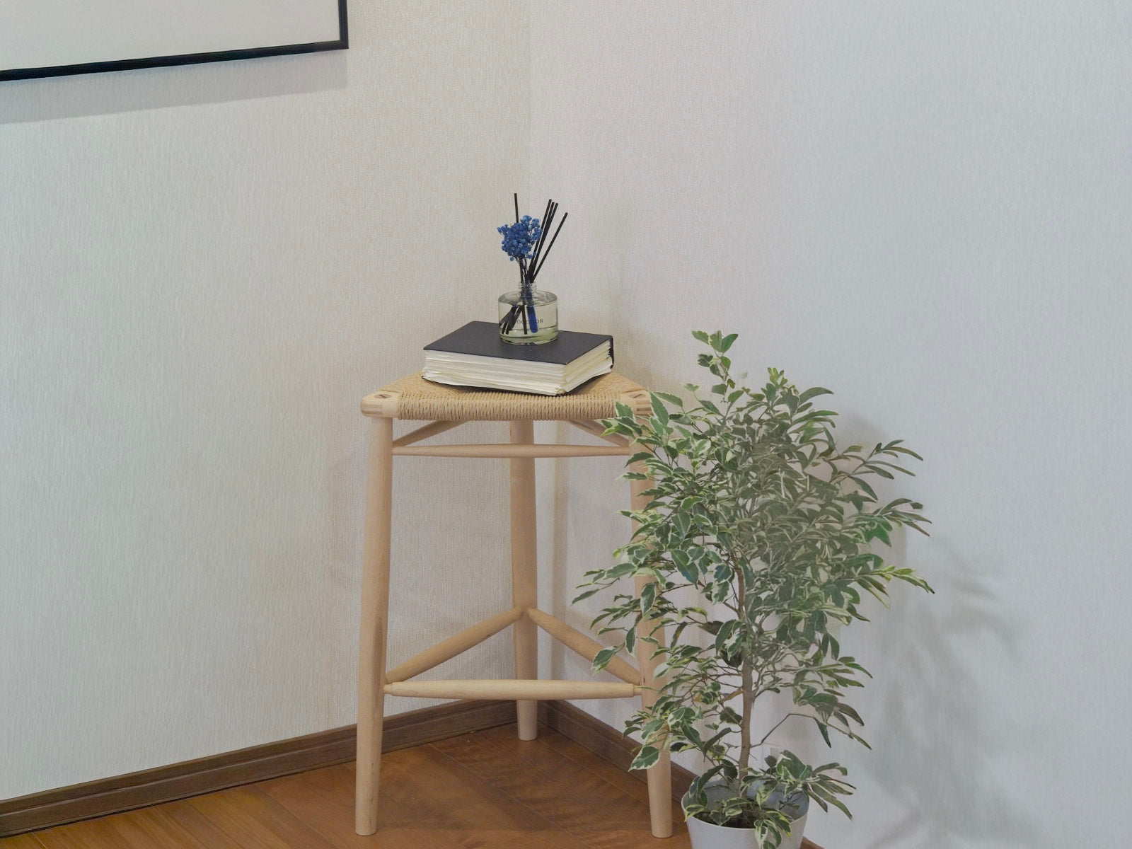 キッチンカウンターに向かって座るのに、ちょうどいい高さのスツールをあえてディスプレイスペースとして使うことで、空間に心地よいリズムが生まれます。 三角形の座面はコーナーに収まりやすく、観葉植物の隣に置くだけで、自分だけのおしゃれなアトリエのような雰囲気を演出できます。