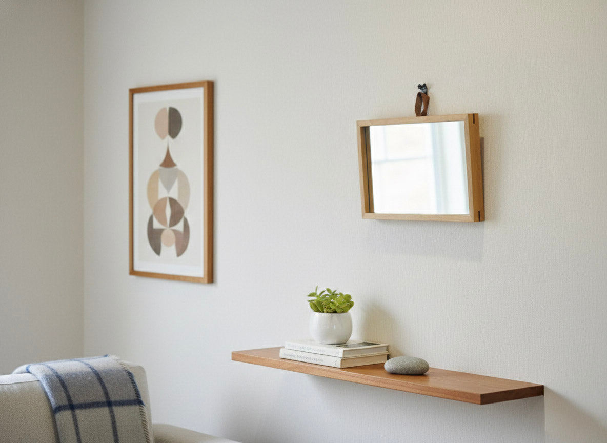 「限られたスペースでも、見た目にこだわりたい。」 そんな方にぴったりのフェイスミラー。置き型でも壁掛けでも使え、縦横どちらの向きにも対応。シンプルでありながら重厚感があり、インテリアの主役としても成立するデザインです。天然木のフレームと職人の手仕事で仕上げられた高品質なつくりは、空間に上質な落ち着きをもたらします。ナラとウォールナットの上品なコントラストが空間を引き締め、リビングにも寝室にも自然に馴染みます。