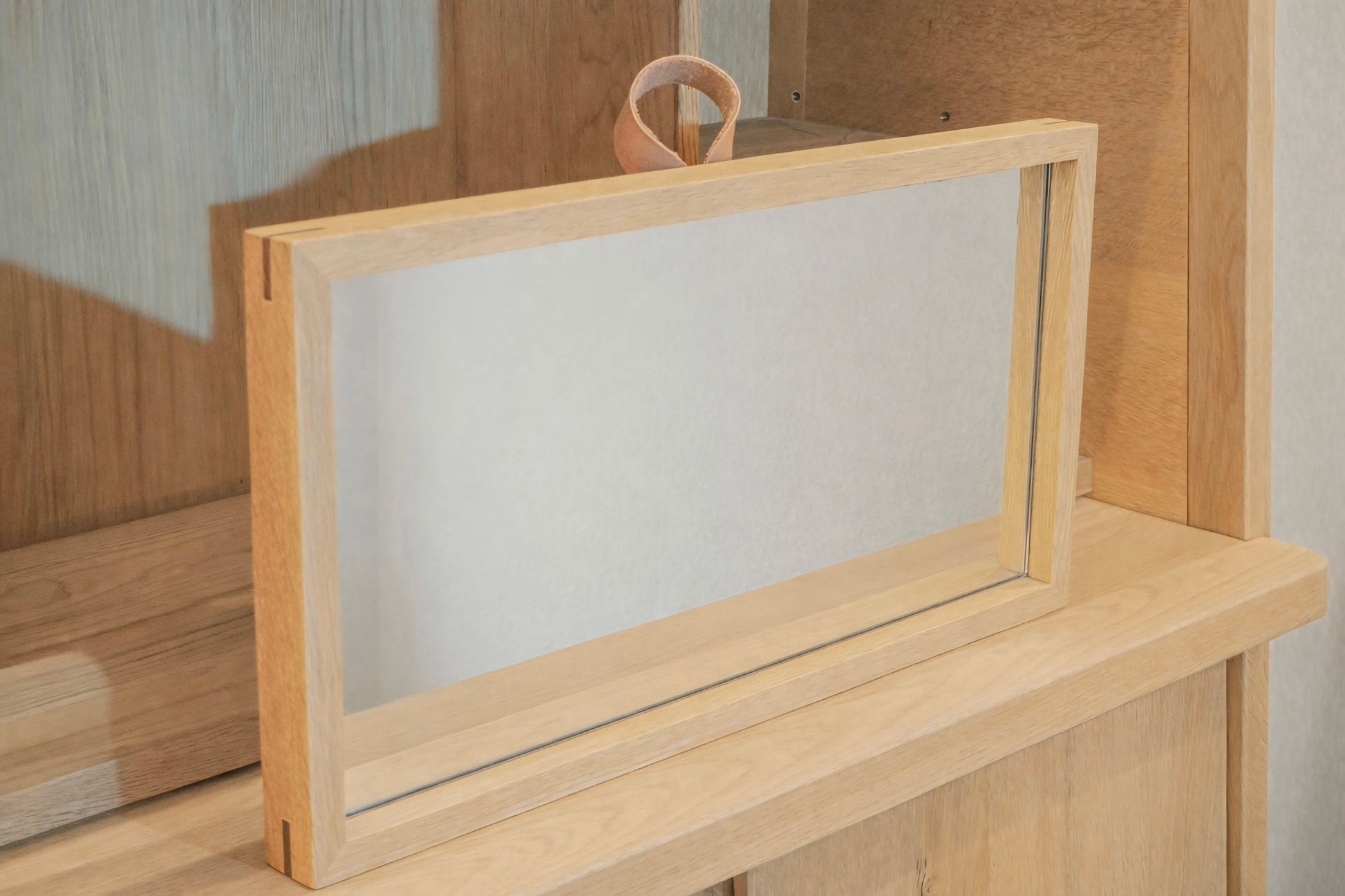 フレームには、やわらかな木目が美しい北海道産のナラの木を使用。角には深みのあるウォールナットを組み合わせ、淡い色合いの中に上品なアクセントを加えています。ナラのあたたかみとウォールナットの重厚さが調和し、どんな空間にも自然と落ち着きをもたらします。
