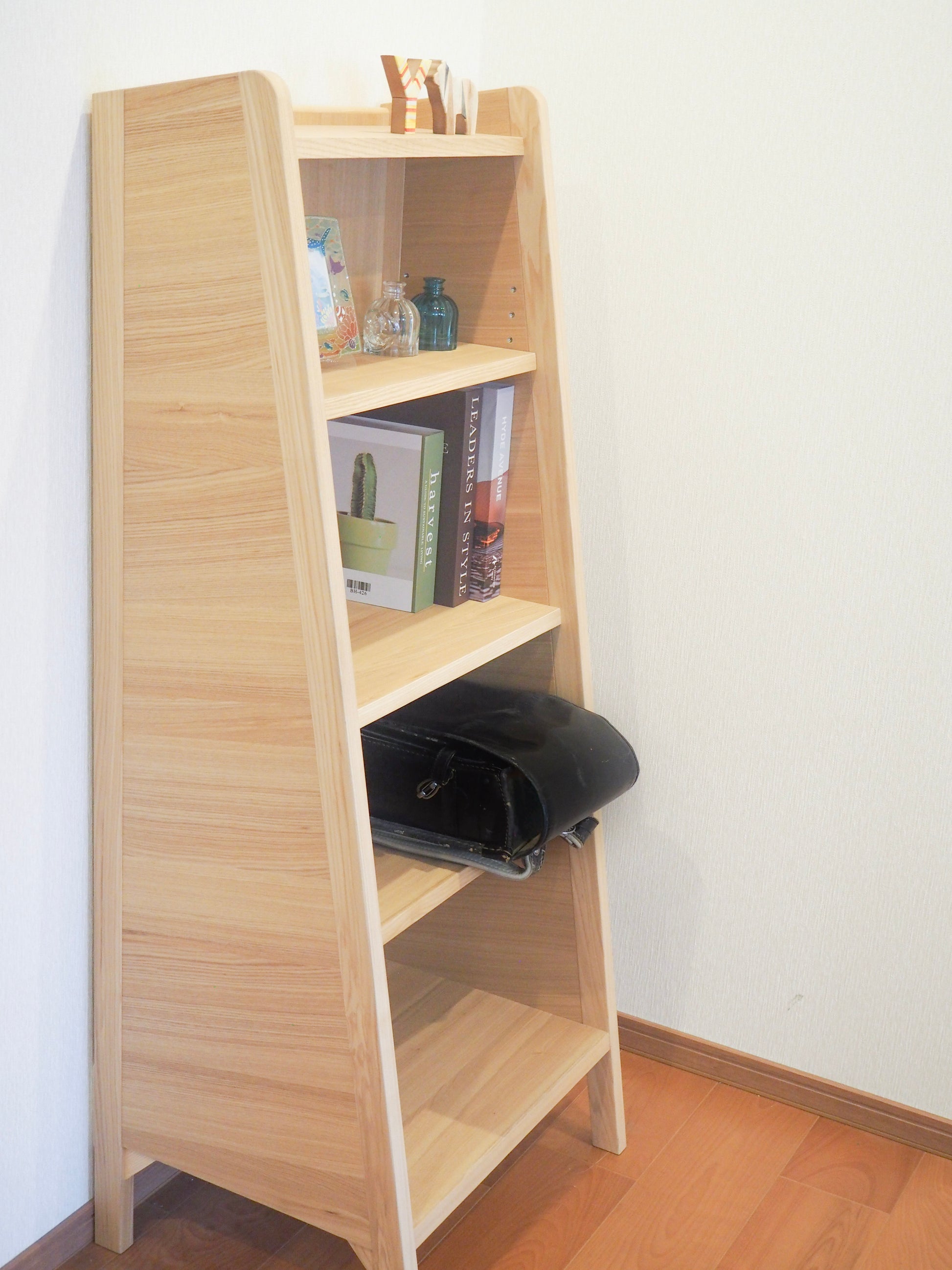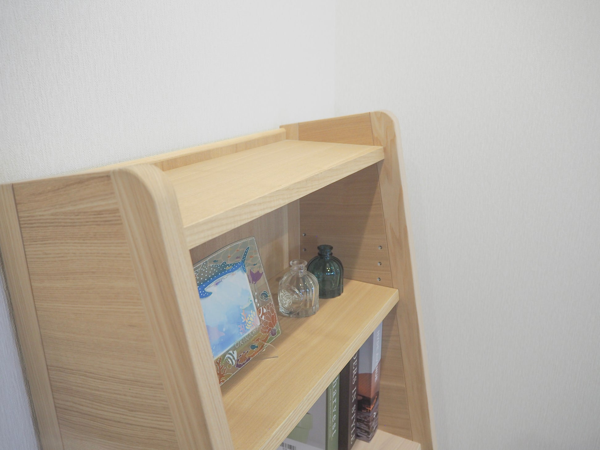 このシェルフの一番の特徴は、棚板を「斜め」に設置できること。ランドセルを口を上に向けて収納すれば、フタを開けたまま本やノートを出し入れでき、毎日の準備がスムーズに。使わないときは棚板を水平に戻して通常の収納としても使えます。お子さまの成長やライフスタイルに合わせて形を変えられる、柔軟なデザインです。