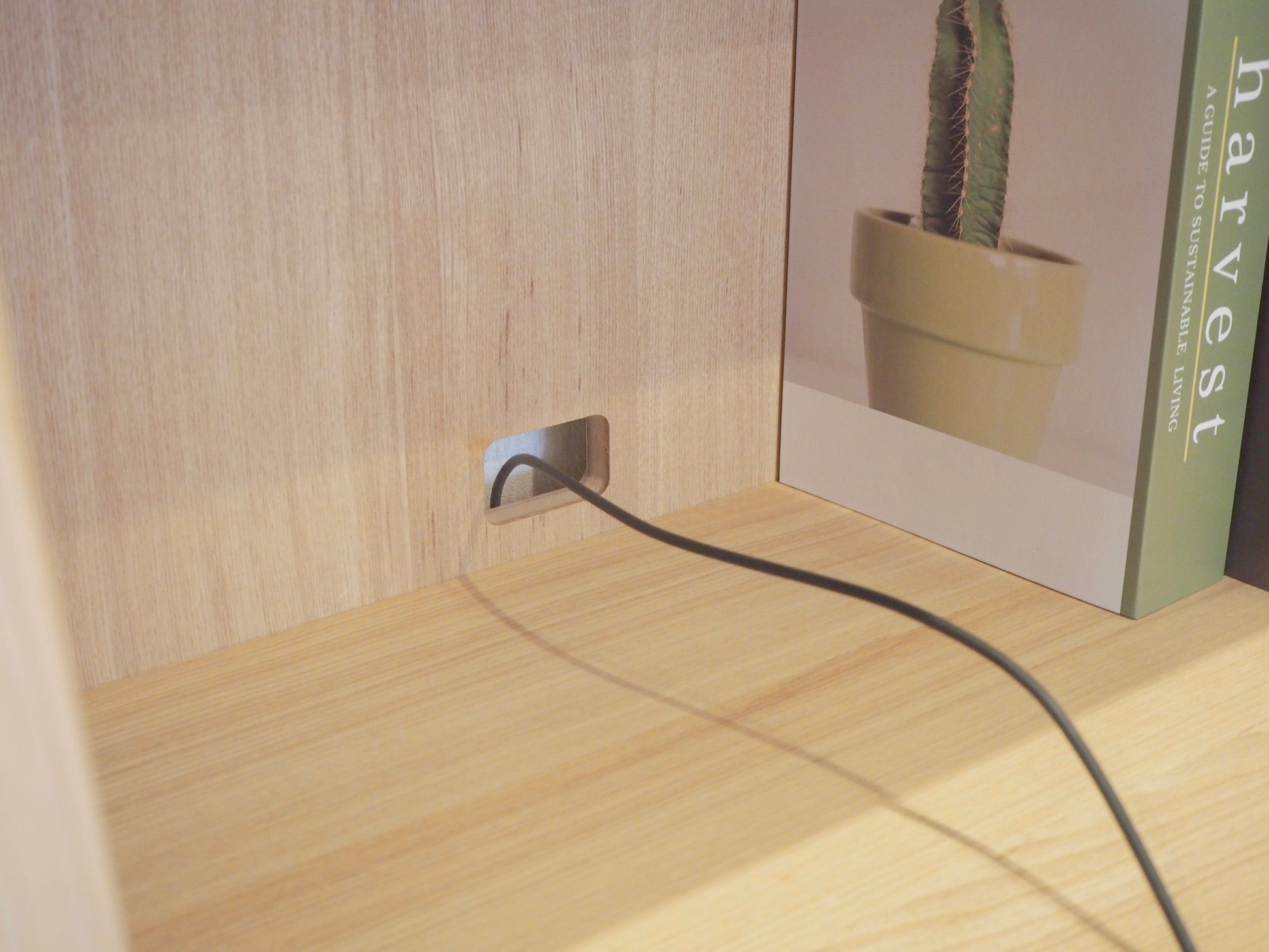 上段の穴は、タブレットやライトのコードを背面に通すのに便利。下段の穴からは、電源タップや充電器のコードをすっきりまとめられます。配線を背面で整理できるので、見た目がすっきり保て、学習スペースやワークスペースとしても快適に使えます。