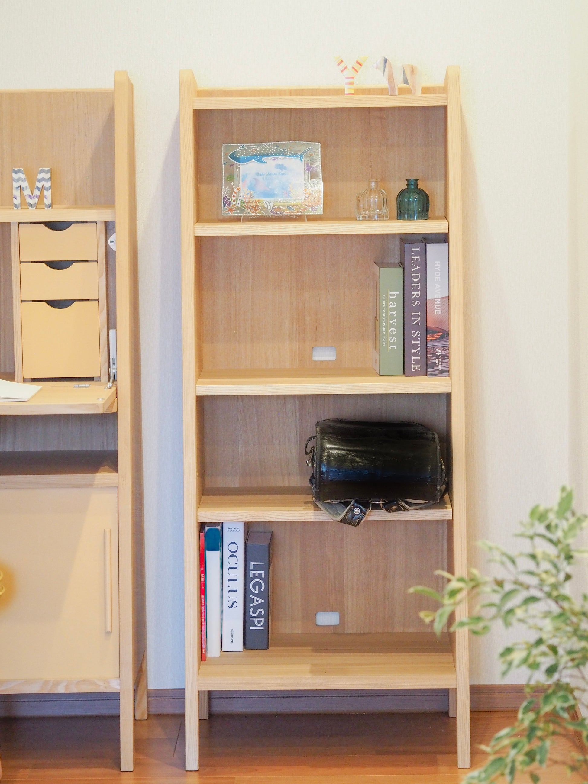 それでも、棚の間隔や奥行きを無駄なく設計しているため、教科書やファイル、ランドセルまでしっかり収納できます。棚板は可動式で、高さを細かく調整可能。収納するものの形やサイズに合わせて自在に変えられるから、空間を余すことなく使えます。本や書類の整理はもちろん、季節の小物や端末機器の置き場所としても活躍。限られたスペースでもすっきり収まり、見た目以上の収納力を発揮します。