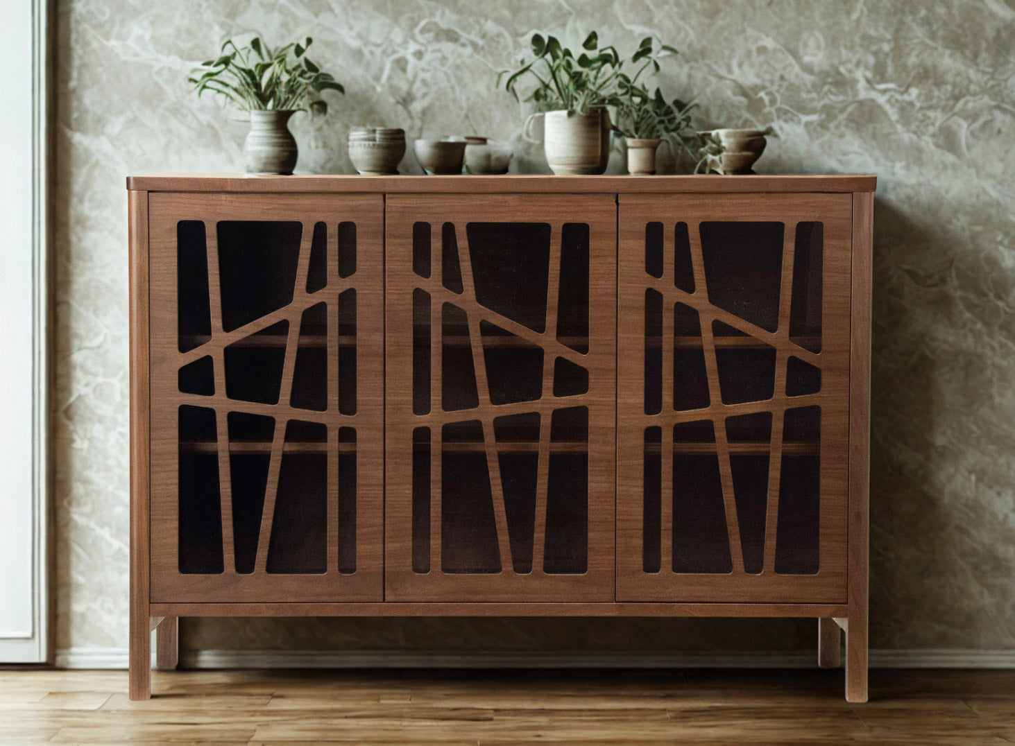 木目のあたたかさと繊細なラインが調和し、収納家具でありながらも部屋全体をやさしく整える存在に。木のぬくもりと小枝のモチーフが、暮らしにやさしい落ち着きを与えてくれます。