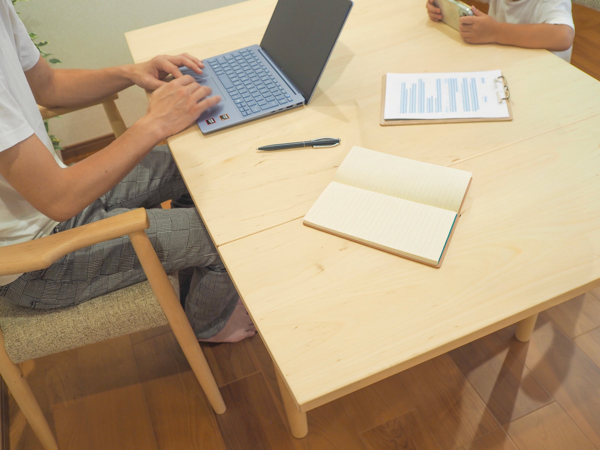 このテーブルは、たたんでいるときには継ぎ目が一切なし。一枚板のような見た目で、掃除もひと拭き。子どもが納豆ごはんをうっかりこぼしても、気になりません。