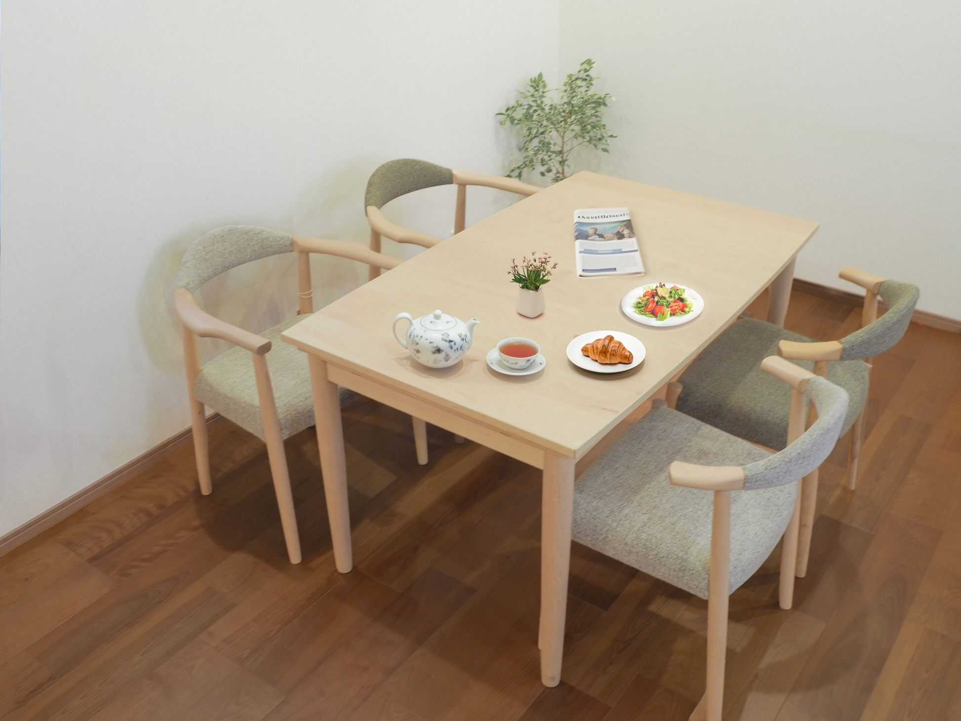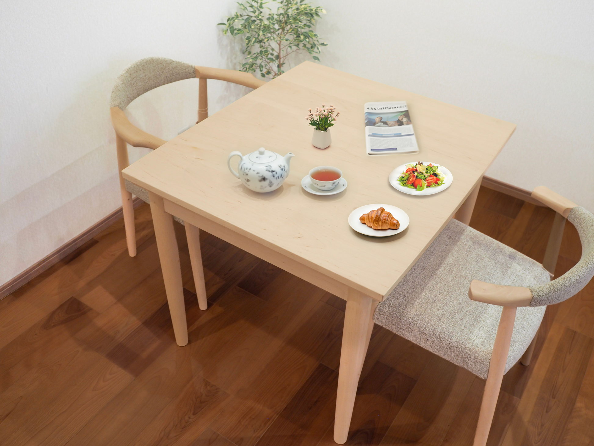 通常は幅90cmで、ふたりで向かい合うのにちょうどいいサイズ。パンやサラダ、紅茶やティーポットを並べても余裕があり、落ち着いた日常の食卓になります。普段の朝ごはんや晩ごはんをシンプルに楽しむときにぴったり。